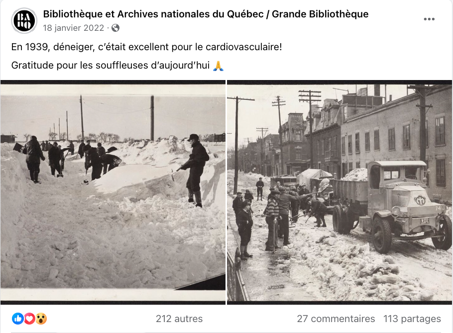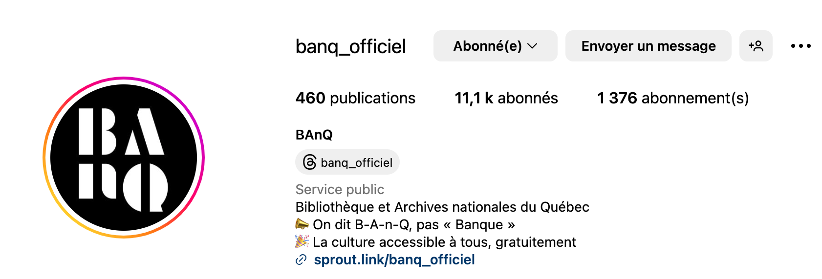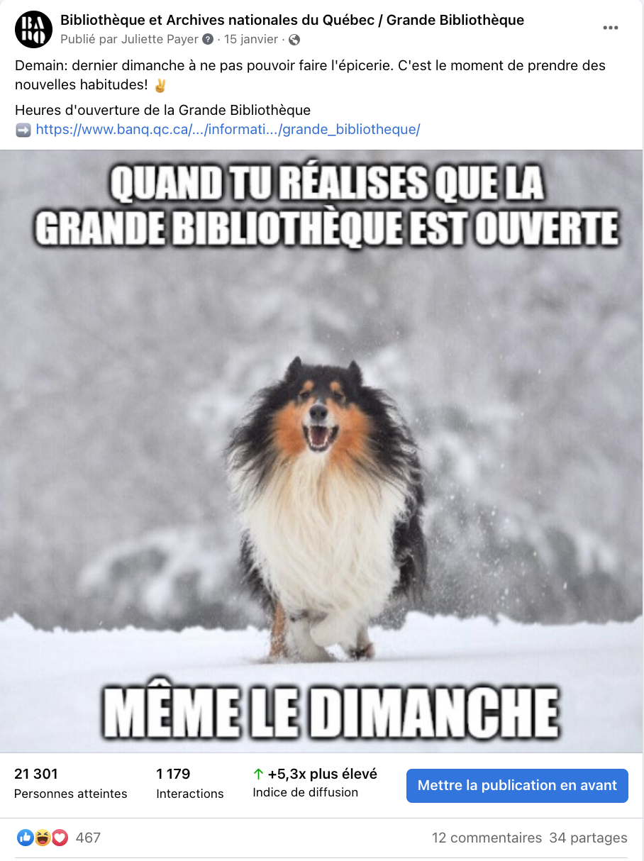 J’ai occupé le poste d’Animatrice de communauté à BAnQ (Bibliothèques et Archives nationales du Québec) pendant près d’un an. Étant donné la variété des chapeaux que l’institution possède (activités, archives, bibliothèque nationale, ressources en ligne, etc!), il a fallu utiliser de la créativité pour passer nos messages et utiliser des référents communs, comme des émotions, souvent véhiculées par des memes.